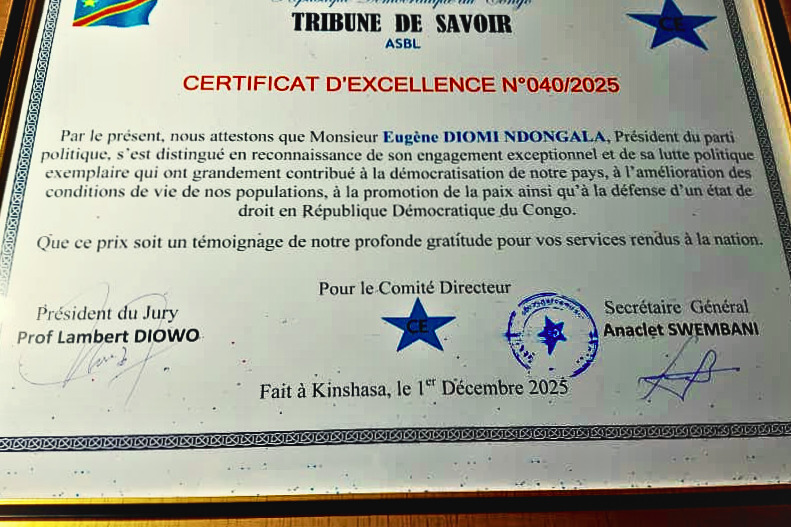 La Tribune de Savoir ASBL a décerné, ce jeudi, un Certificat d’Excellence à Monsieur Eugène Diomi Ndongala, figure emblématique de la scène politique congolaise et président de son parti. Ce prestigieux diplôme, enregistré sous le numéro 040/2025, vient reconnaître des années d’engagement, de résilience et de contribution active à la vie démocratique en République démocratique du Congo.