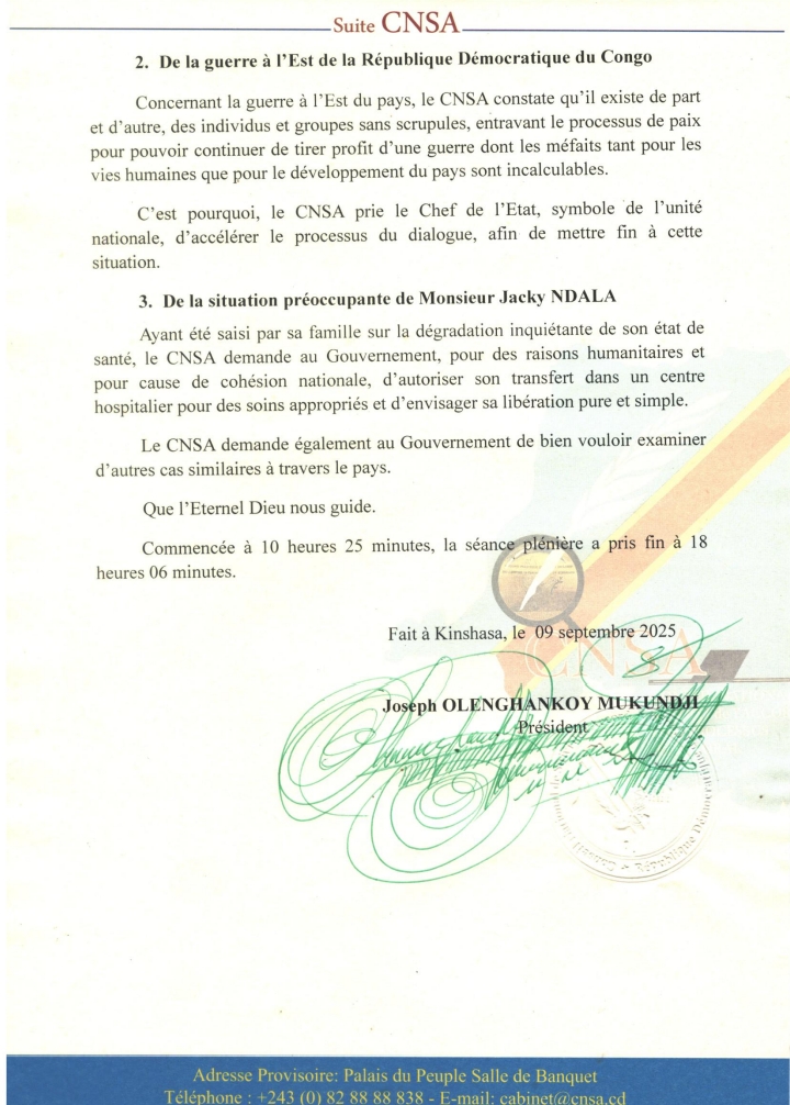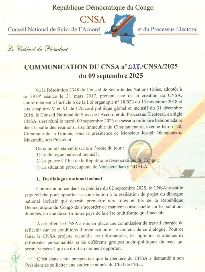 Vu la Résolution 2348 du Conseil de Sécurité des Nations Unies, adoptée à sa 7910 séance le 31 mars 2017, prenant acte de la création du CNSA, conformément à l’article 6 de la Loi organique nº 18/023 du 13 novembre 2018 et aux chapitres V et VI de l’Accord politique global et inclusif du 31 décembre 2016, le Conseil National de Suivi de l’Accord et du Processus Électoral, en sigle CNSA, s’est réuni le mardi 16 septembre 2025 en session ordinaire hebdomadaire dans la salle des réunions, sise Immeuble du Cinquantenaire, avenue Isiro n°28, Commune de la Gombe, sous la présidence de Monsieur Joseph Olenghankoy Mukundji, son President.