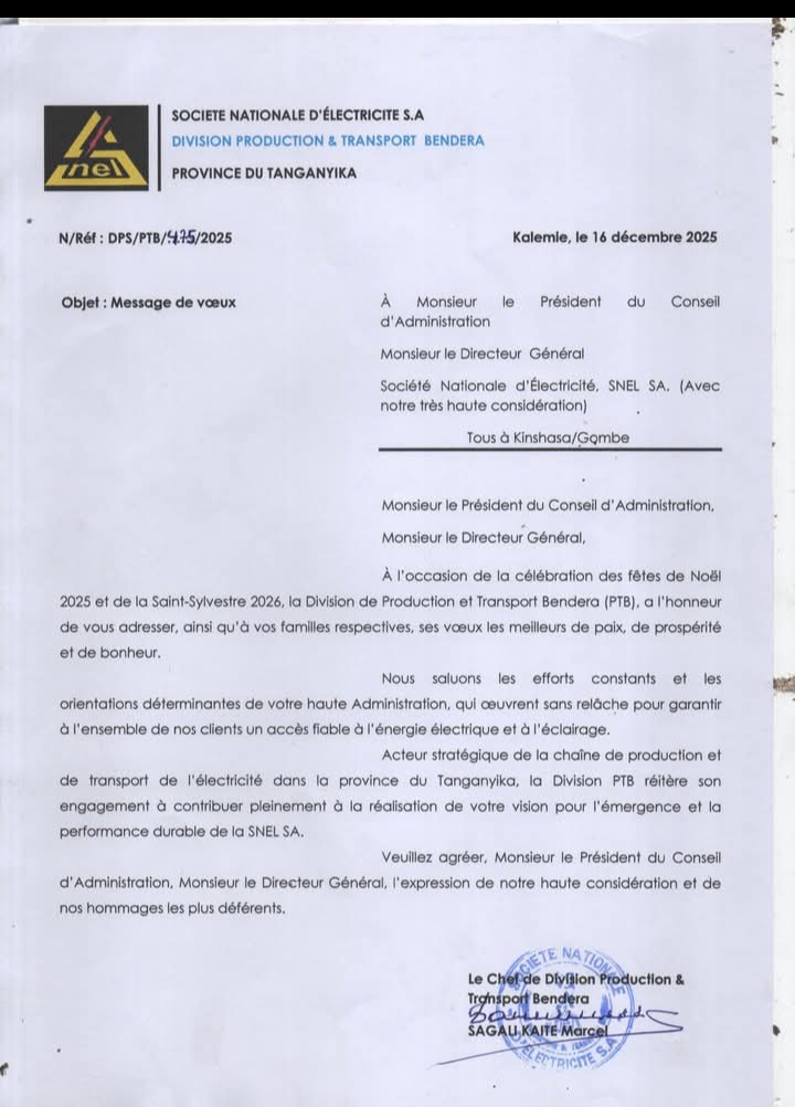À l’occasion des fêtes de Noël 2025 et de la Saint-Sylvestre 2026, la Division Production & Transport Bendera (PTB) de la Société Nationale d’Électricité (SNEL SA), basée à Kalemie dans la province du Tanganyika, a adressé un message de vœux au Président du Conseil d’Administration et au Directeur Général de l’entreprise.